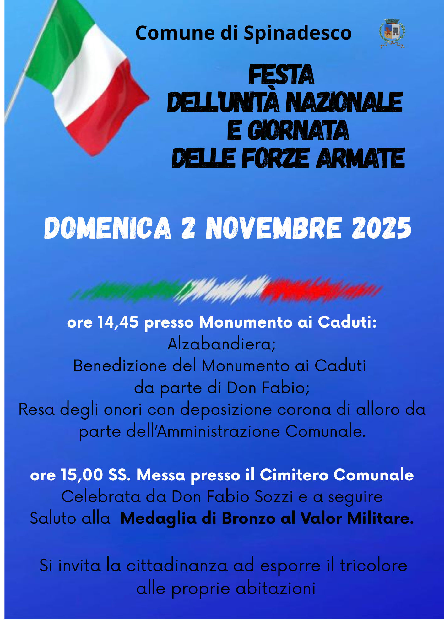 DOMENICA 2 NOVEMBRE 2025 alle ore 14,45 presso il MONUMENTO AI CADUTI: alzabandiera, benedizione e disposizione corona alloro.