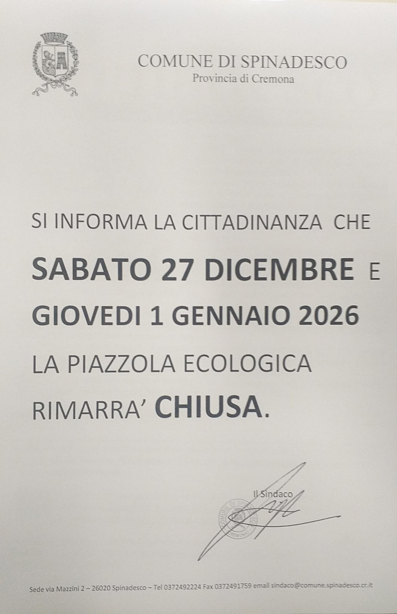 Si avvisa la cittadinanza che la Piazzola Ecologica rimarrà chiusa: